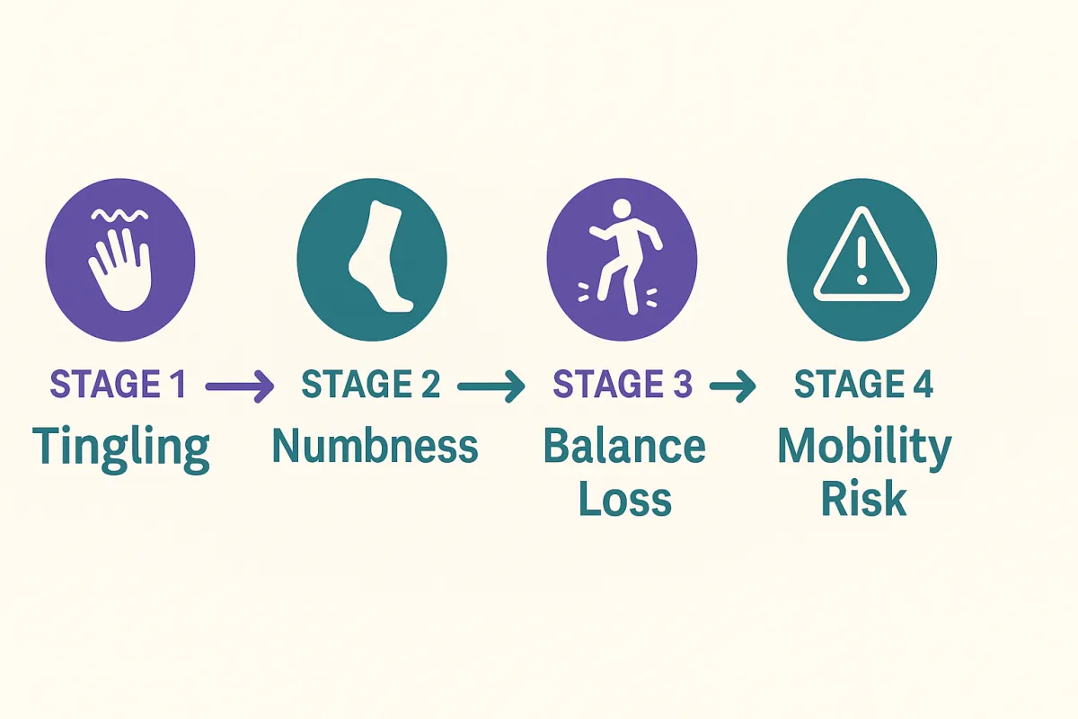 Neuropathy works the same way. Tingling. Cramping. Numbness. Loss of balance.