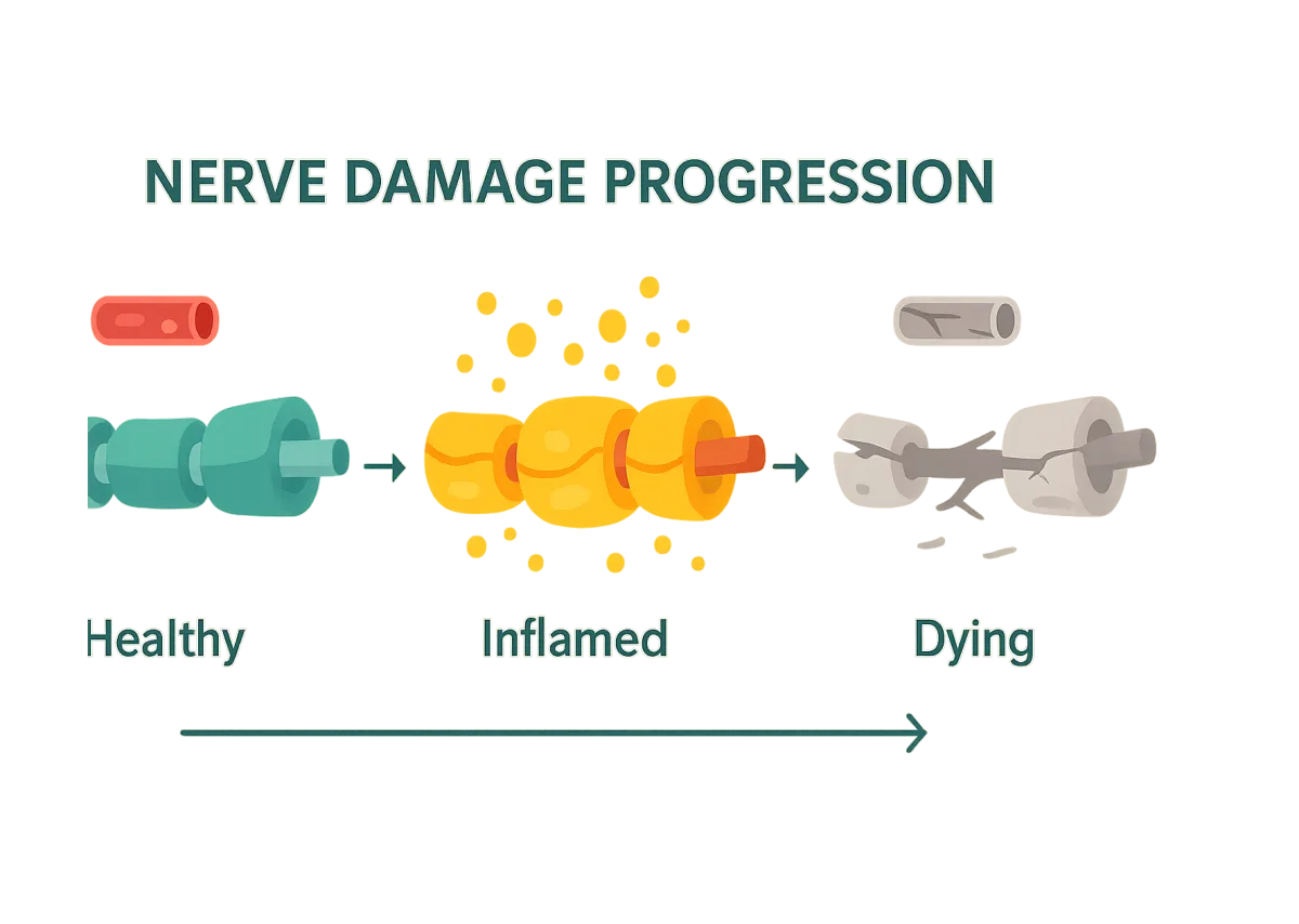 But when those vessels get blocked or narrow — often due to diabetes, inflammation, or unknown causes — the nerves slowly start to break down.